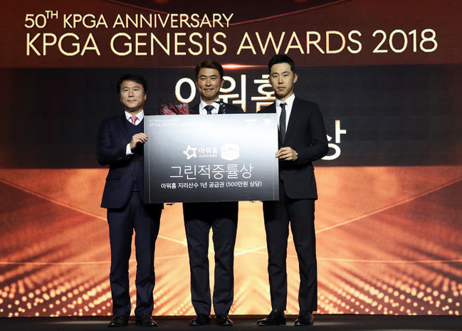 ‘아워홈 그린적중률’은 2018 KPGA 코리안투어 경기 중 그린적중률이 가장 높은 선수에게 시상하는 상으로, 문경준 선수가 수상했다. 문경준 선수에게는 부상으로 아워홈 지리산수 1년 공급권을 제공했다.