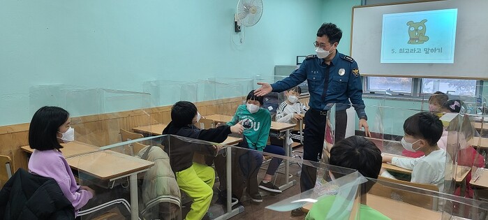 꿈TREE 학교폭력예방의 달을 맞이하여 오산경찰서 여성청소년계 김승화경사는 방과후아카데미 꿈TREE에 방문하여 학교폭력예방교육을 진행하였다. 비나리반(4학년)은 학교전담경찰관에대한 직업 탐색과 더불어 학교폭력의 유형과 학교폭력 예방 방법에 대해 알아보았고 한마루반(5, 6학년)은 신체폭력을 중점으로 처벌과 신고의 중요성 등의 수업을 진행하였다.