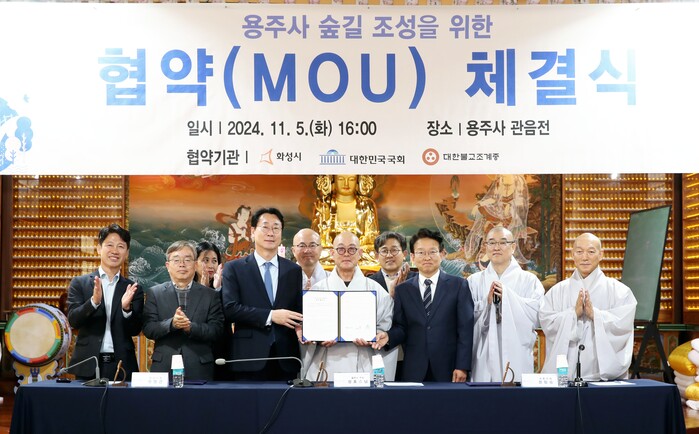 5일 용주사에서 개최된 이번 협약식에는 화성시, 용주사, 권칠승 국회의원이 협약 당사자로 참여했다.
