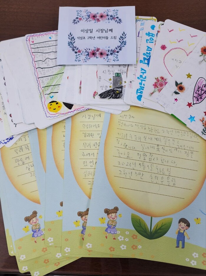 이와 관련해 이 시장은 이날 자신의 페이스북을 통해 이 편지들은 석성초등학교에 실내체육실을 만들어준 데 대해 제게 감사의 뜻을 전하고 싶다며 보내준 편지라고 밝혔다.