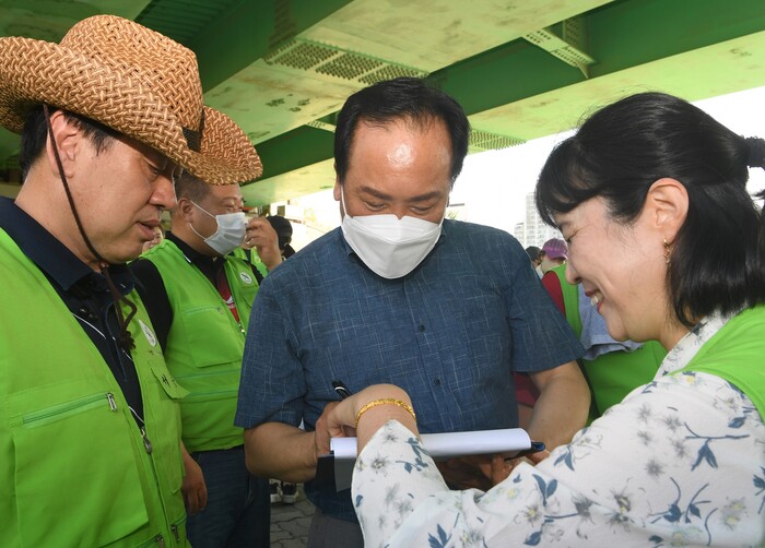 이날 행사에는 지난 6·1 지방선거에서 당선된 이권재 오산시장과 성길용 오산시의회의장을 비롯한 도의원 및 시의원들 전원이 참석한 가운데 지난 폭우에 침수되고 흘러 들어온 쓰레기를 치우며 자연보호 협의회 회원들과 함께 구슬땀을 흘리며 진행되었다.