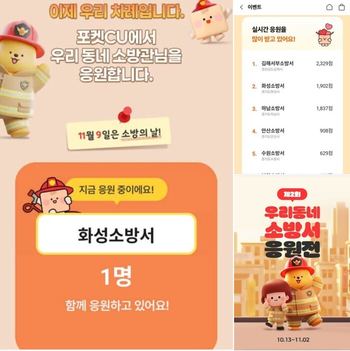 그러면서 “이벤트 참여는 포켓CU 앱에서 11월 2일까지 1시간마다 한 번씩, 11시~12시와 밤 9시~10시에는 2회 참여할 수 있다”며 “평소 우리의 안전을 위해 희생하고 고생하시는 소방관 여러분께 화성특례시의 따뜻한 마음과 저력을 보여달라. 시민 여러분의 참여 한 번, 클릭 한 번이 우리 소방관들께 큰 힘과 응원이 된다”고 강조했다.