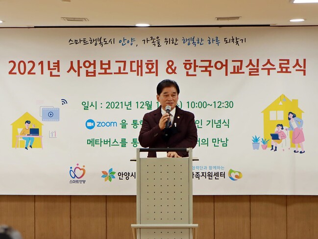 [로컬라이프] 송준형 기자 = 최우규 안양시의회 의장은 12월 1일 동안구청 별관(3층)에서 개최된 “안양시 건강가정·다문화가족 지원센터 2021 사업보고회 및 한국어교실 수료식” 행사장에 참석했다고 밝혔다.
