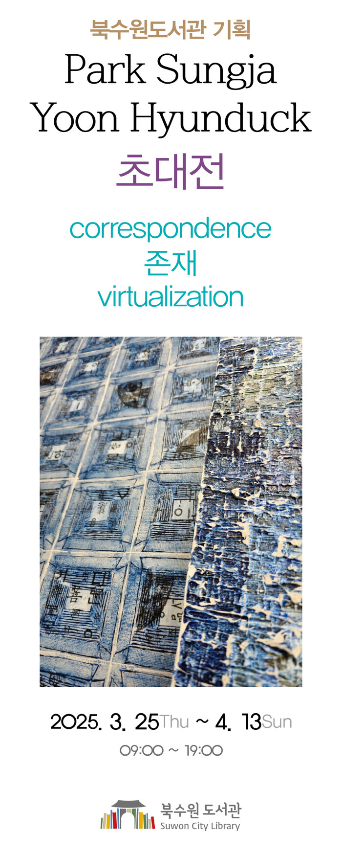 수원시 북수원도서관은 박성자·윤현덕 작가 초대전 ‘correspondence(코레스폰던스) 존재 virtualization(버추얼리제이션)’을 4월 13일까지 연다.