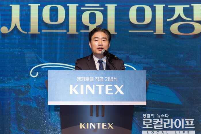 | ▲ 김운남 고양특례시의회 의장이 ‘킨텍스 앵커호텔 착공 기념식’에 참석해 축사를 하고 있다. (사진출처=김운남 페이스북) |