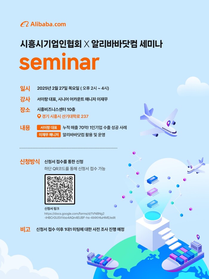 시흥시 기업인협회가 2월 27일 오후 2시 시흥비즈니스센터 10층에서 ‘기업 교류 활성 세미나’를 개최한다. 이번 행사는 중국 알리바바 그룹의 기업 간 전자상거래(B2B) 플랫폼인 ‘알리바바 닷컴’과 협력해 진행되며, 수출 확장을 목표로 하는 기업인과 경영진을 대상으로 글로벌 비즈니스 전략과 운영 기술을 공유할 예정이다.