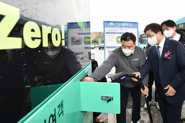 수원 동부버스공영차고지에 전기버스 충전기와 태양광발전설비로 이뤄진 ‘친환경 에너지복합시설’이 구축됐다.