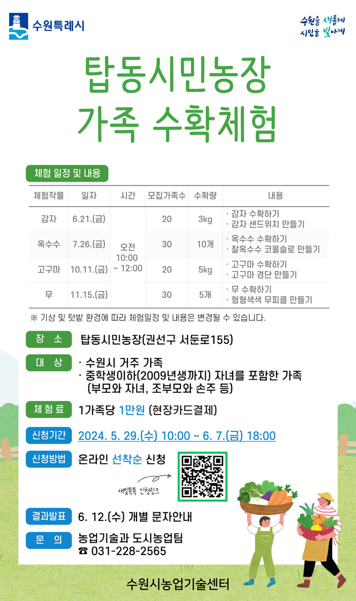 수원시(시장 이재준)가 가족 세대 간 소통과 우리농업의 이해를 돕고자 ‘탑동시민농장 가족수확체험’ 행사를 연다.