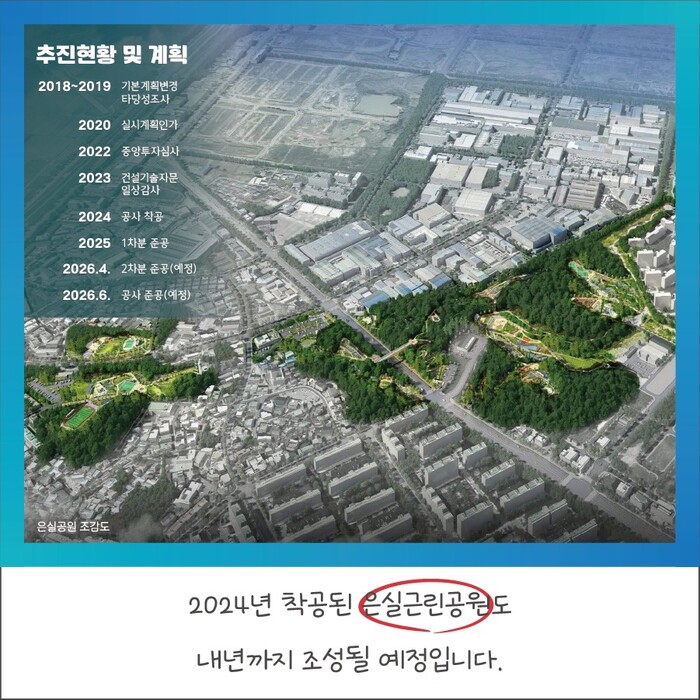 또한 장기미집행공원들도 시민의 공간으로 되살아나고 있다면서, 총 15곳의 장기미집행공원을 지켜내 이 중 6곳은 공사가 완료된 상태이며, 모산공원과 은실공원도 내년에 준공될 예정이라고 전했다.