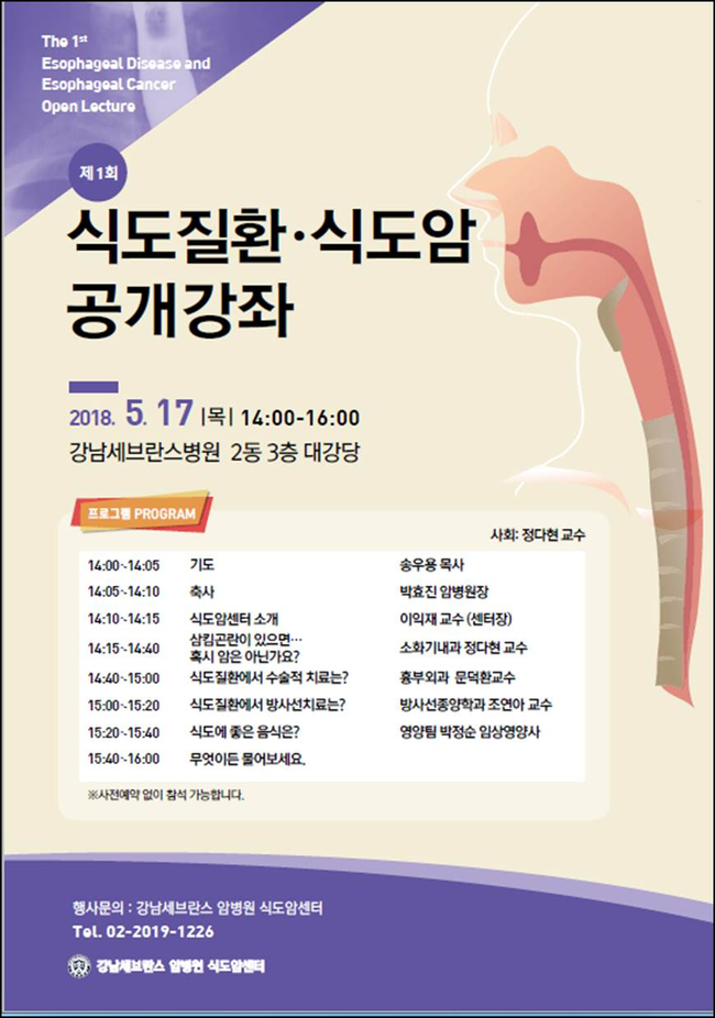 강남세브란스병원은 오는 17일 오후 2시부터 병원 3층 대강당에서 식도질환 및 식도암 공개강좌를 개최한다.
