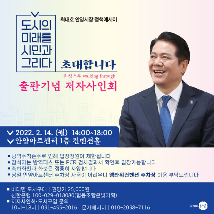 한편, <도시의 미래를 시민과 그리다> 출판기념회는 2월 14일 월요일 오후 2시부터 6시까지 안양아트센터 1층 컨벤션홀에서 개최될 예정이다.
