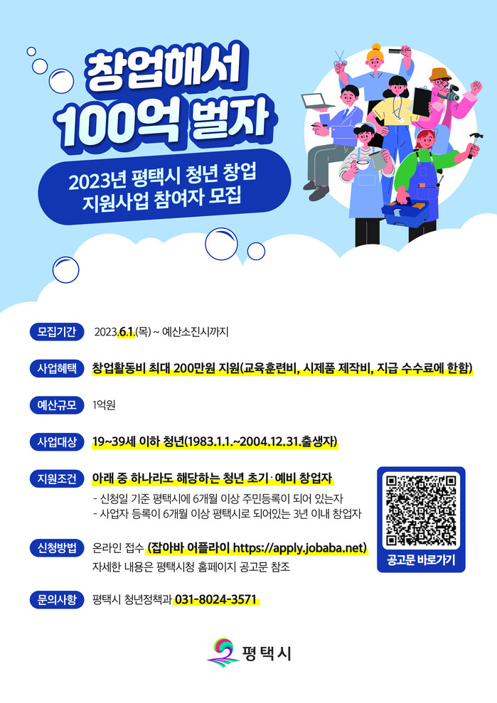 평택시(시장 정장선)는 창업 초기 경제적 여건 등으로 어려움을 겪고 있는 청년 초기.예비 창업자의 안정적인 사업 정착을 지원하기 위하여 오는 6월 1일부터 예산 소진할 때까지 신청‧접수를 받을 것이라고 밝혔다.