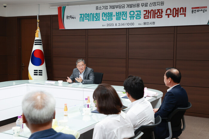 용인특례시가 지난 2일 시청 접견실에서 중소기업을 대상으로 개발부담금 산정을 무료로 지원한 4개 기관에 지역선행 감사장을 수여했다.