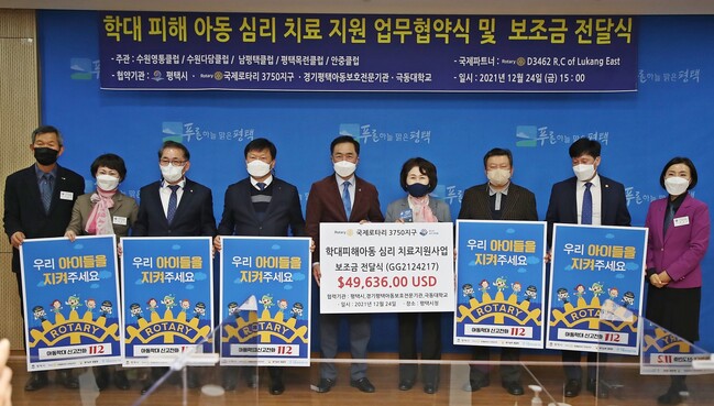 한편, 정장선 시장은 “학대 피해 아동을 위해 후원을 약속해주신 국제로타리3750지구 회원들에게 감사드린다”며 “학대 피해 아동 심리치료 사업을 차질 없이 추진해 아동이 행복한 평택시를 만들 수 있도록 노력하겠다”고 밝혔다.