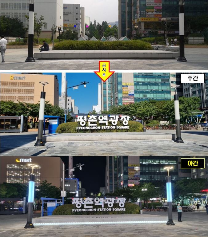 시는 평촌역 광장에 대형 시계탑 외에도 ‘평촌역광장’ 지명 안내판을 신규 설치했다. 또 기존의 소규모 공연이 열렸던 야외무대를 새로 정비하고 파고라 하부의 노후 바닥 및 앉음벽을 말끔히 정비했다.