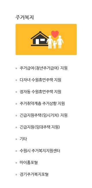 ▲주거 급여(청년주거 급여) ▲다자녀·정자동 수원휴먼주택 ▲주거취약계층 주거 상향 지원 ▲긴급지원주택(임시거처) ▲긴급 지원(임대주택 지원) ▲마을사랑방 ▲주거 취약계층 집수리사업 ▲공공하수도 사용료 지원 ▲사회복지기금(자활 계정) 전세자금 대출 ▲저소득 장애인 이사비 지원 ▲가사홈서비스 YES 생활민원처리반 운영 ▲저소득층 클린케어 사업(주거환경개선) ▲영구임대주택 등의 공동전기 요금 지원 등 수원시의 모든 주거복지 서비스를 확인할 수 있다.