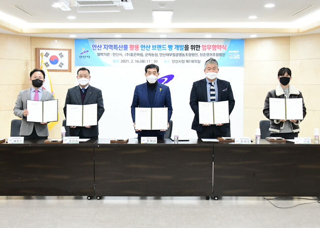시는 16일 시청 제1회의실에서 ㈜좋은아침, 군자농협, 안산대부밀 콩 영농조합법인, 청춘영어조합법인 등과 ‘지역특산물을 활용한 안산 브랜드 빵 개발을 위한 업무협약’을 체결했다.