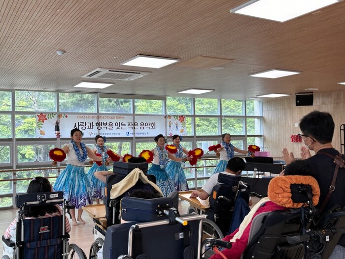 사진/ 수원시 여성문화공간 휴의 나니 아이나훌라 동아리(훌라댄스)가 장애인 시설을 방문해 재능기부 공연을 펼치고 있다.(사진제공=수원시)