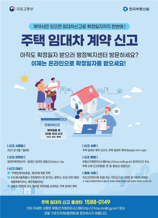 단, 6월 1일 이전 계약을 체결한 경우나 보증금 6,000만원 이하, 월세 30만원 이하의 계약 건은 신고대상이 아니며. 임대차 보호를 받기 위해서는 기존처럼 읍·면사무소를 방문해 확정일자를 받으면 된다.