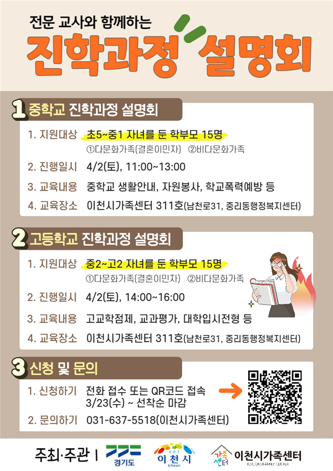 이천시는 자녀들의 중·고등학교 진학 정보 부족으로 어려움을 겪는 다문화가족을 위해 경기도와 경기도교육청이 함께하는 ‘다문화가족 진학 과정 설명회’를 4월 2일 이천시 가족센터에서 개최한다.