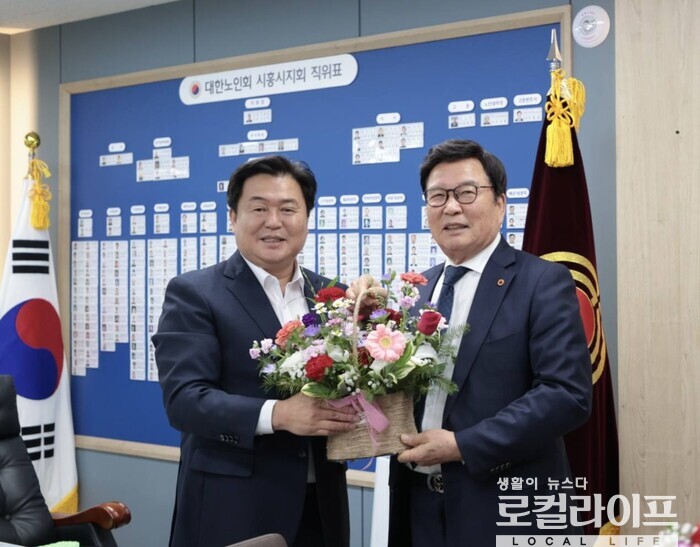 | ▲ 임병택 시흥시장(왼쪽)이 대한노인회 시흥지회를 찾아 김연규 지회장(오른쪽)과 인사를 나누고 있다. (사진출처=임병택 페이스북) |