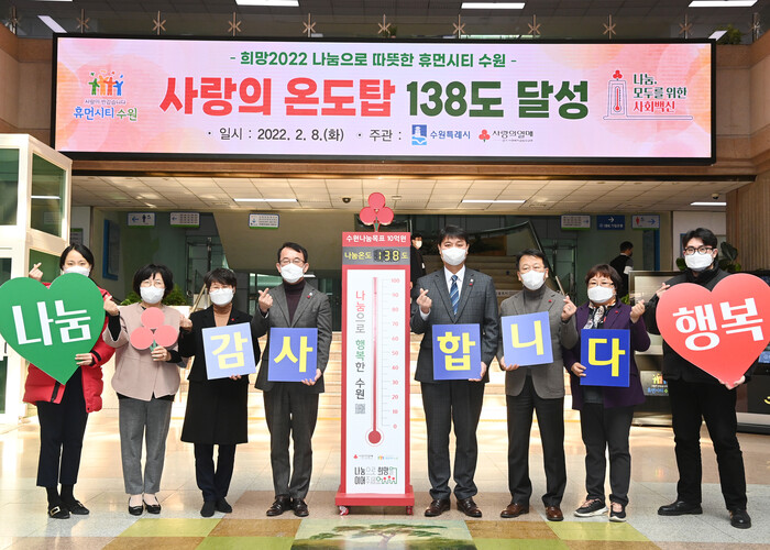 수원시와 경기사회복지공동모금회가 지난해 12월부터 올해 1월 말까지 전개한 ‘희망 2022 나눔 캠페인’이 목표(10억 원 모금)를 초과 달성하며 마무리됐다. 1000만 원이 모금될 때마다 1℃씩 상승하는 ‘사랑의 온도탑’은 138℃까지 올라갔다.