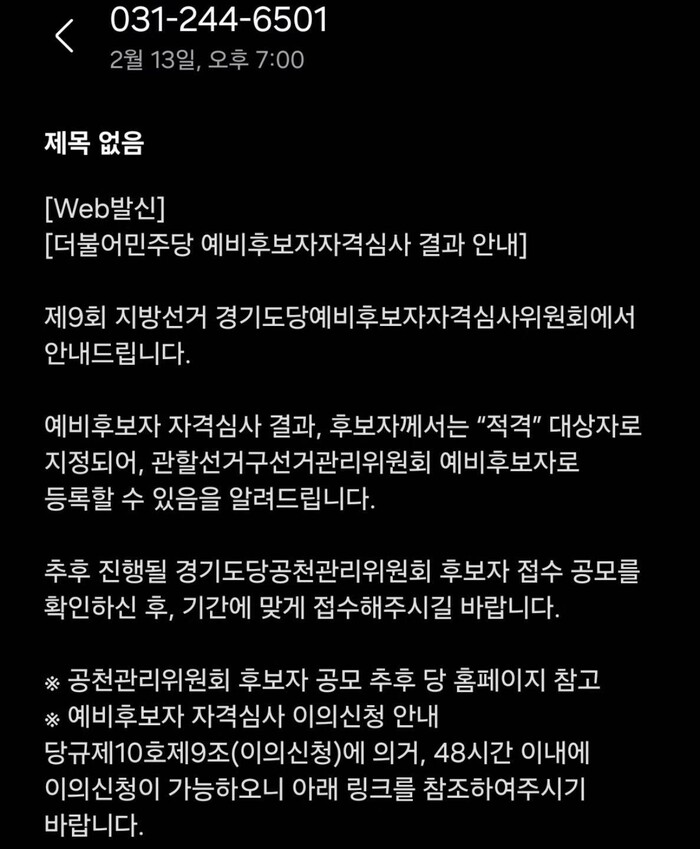 [구리=로컬라이프] 송준형 기자 = 신동화 구리시의회 의장은 13일 오후, 더불어민주당 경기도당으로부터 제9회 지방선거 예비후보자 자격심사 결과, "적격" 대상자로 지정되었다는 통보를 받았다.