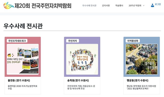 행정안전부와 대통령소속 자치분권위원회 등이 주관한 제20회 전국주민자치박람회는 10월 29일 온라인으로 진행됐다. 1차 서류심사, 2차 인터뷰 심사를 거쳐 70개 우수사례를 선정했고, 온라인전시관 심사와 우수사례 발표로 수상동을 선정했다.