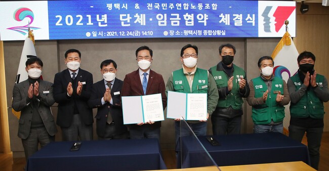 평택시는 정장선 시장과 김성환 전국민주연합노동조합 위원장을 비롯한 노사교섭위원 20명이 참석한 가운데 지난 24일 2021년 단체협약과 임금협약을 체결했다.