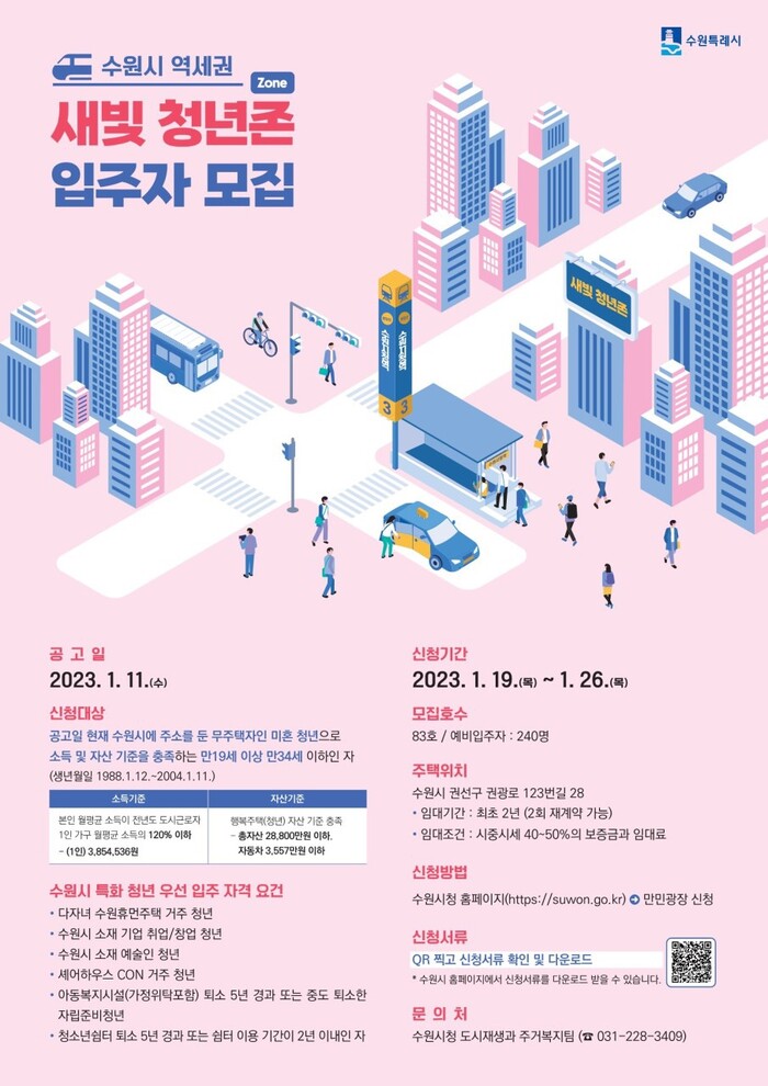 수원시가 역세권 주택을 인근 시세의 절반 이하로 임대하는 ‘새빛 청년존(ZONE)’이 첫 입주자 모집을 시작한다.