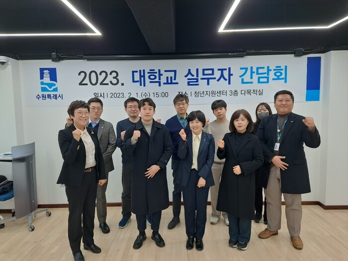 수원시는 1일 청년지원센터에서 ‘2023 대학교 실무자 간담회’를 열고, 관내 5개 대학 실무자에게 수원시의 대학협력사업과 청년정책을 소개했다.