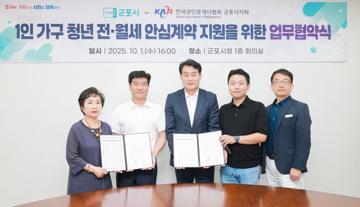 군포시(시장 하은호)는 10월 1일 시청 1층 회의실에서 한국공인중개사협회 군포시지회와 청년 1인 가구 전월세 안심계약 지원을 위한 업무협약을 체결했다.