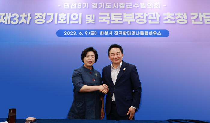 신계용 과천시장과 원희룡 장관의 만남은 지난 9일 화성시 전곡항마리나클럽하우스에서 열린 ‘민선8기 경기도시장군수협의회 제3차 정기회의에서 성사됐다.
