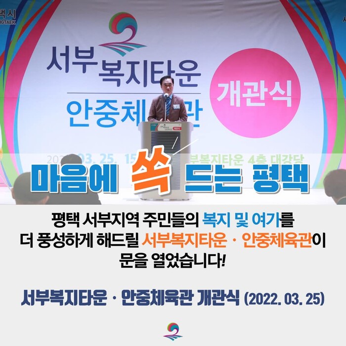 이와 관련해 정장선 시장은 26일, 자신의 페이스북을 통해 평택 서부지역 주민들의 복지증진에 있어 중요한 역할을 할 서부복지타운・안중체육관 개관식이라며 이같이 밝혔다.