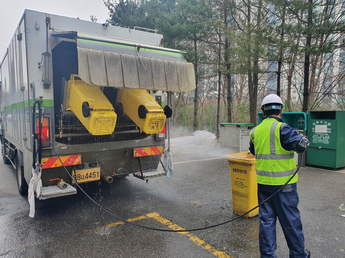 수원시가 공동주택 단지에 설치된 음식물류 폐기물 전용수거용기를 정기적으로 세척해 악취와 해충 발생을 방지한다.