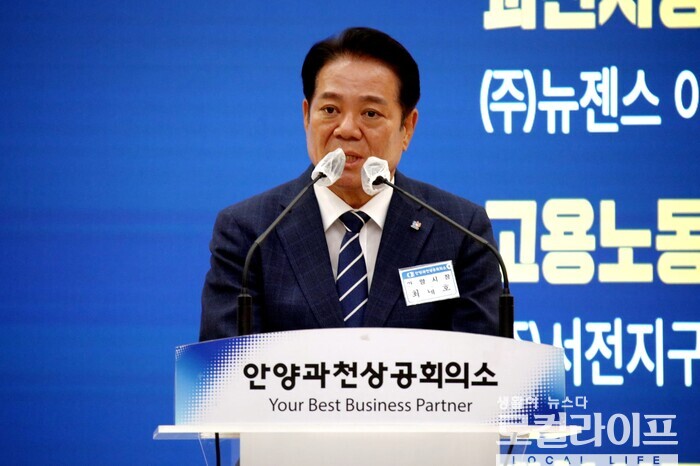 | ▲ 최대호 안양시장이 ‘제41회 안양과천상공대상 시상식’에 참석해 축사를 하고 있다. (사진출처=최대호 페이스북) |