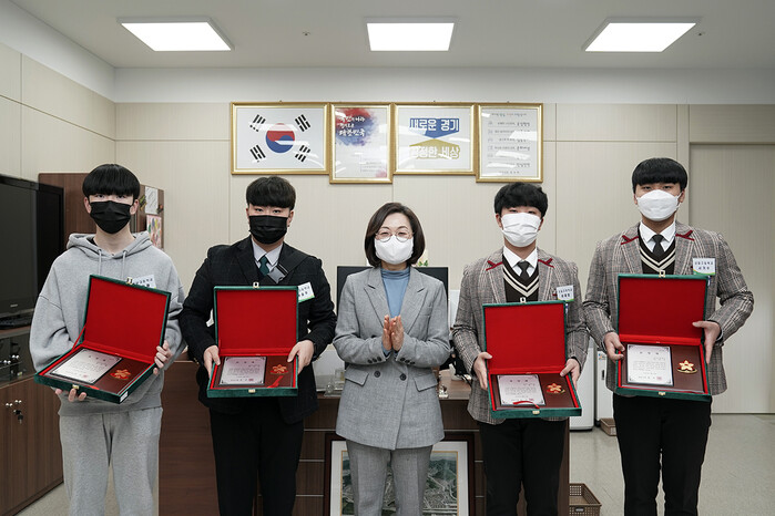 경기 성남시 은수미 시장이 16일 오전 성남시청 시장실에서 지난 13일 중원구 상대원동의 한 상가건물에서 불이 나자 인근 건물의 소화기를 가져다 신속하게 진화에 나서 대형화재의 위험을 막은 전민재·박승주(성남고)·이재희·서기수(성일고) 군 등 4명을 만나 표창을 수여했다.