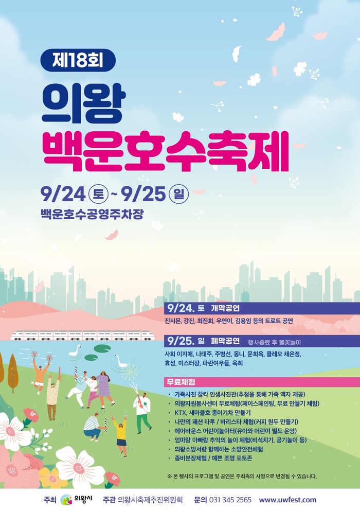 의왕시의 대표 가을축제인 ‘제18회 의왕백운호수축제’가 오는 24, 25일 이틀간 백운호수 공영주차장에서 열린다.