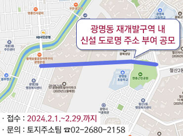 시는 주택 재개발정비사업에 따라 개설되는 새 도로에 부여할 도로명주소 명칭 공모를 오는 2월 1일부터 2월 29일까지 진행한다고 29일 밝혔다. 광명시가 신설 도로의 도로명주소를 시민 공모하는 것은 이번이 처음이다.