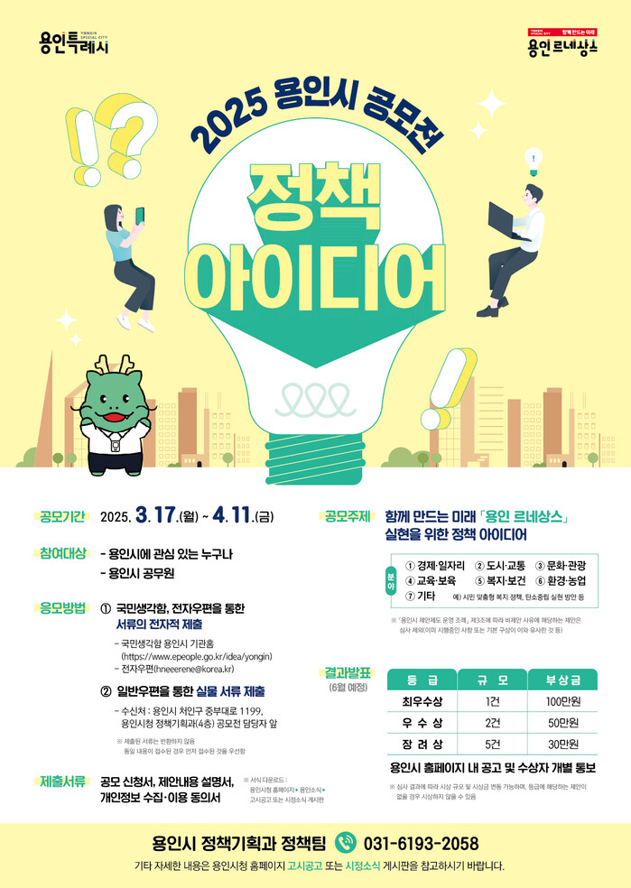 용인특례시(시장 이상일)는 시민의 창의적인 아이디어를 시정에 반영하기 위한 ‘2025년 용인시 정책 아이디어 공모전’을 개최한다고 17일 밝혔다.