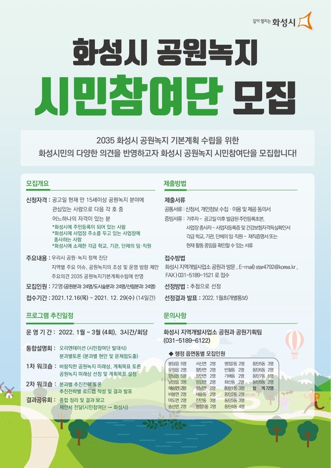 신청은 오는 12월 29일까지 화성시 지역개발사업소 공원과로 직접 제출하거나 이메일(star4792@korea.kr)또는 팩스(031-5189-1521)로 제출하면 된다.