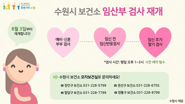 수원시는 8월3일부터 장안구·권선구·팔달구·영통구보건소에서 임산부 관련 검사 업무 3가지를 재개하기로 결정했다.
