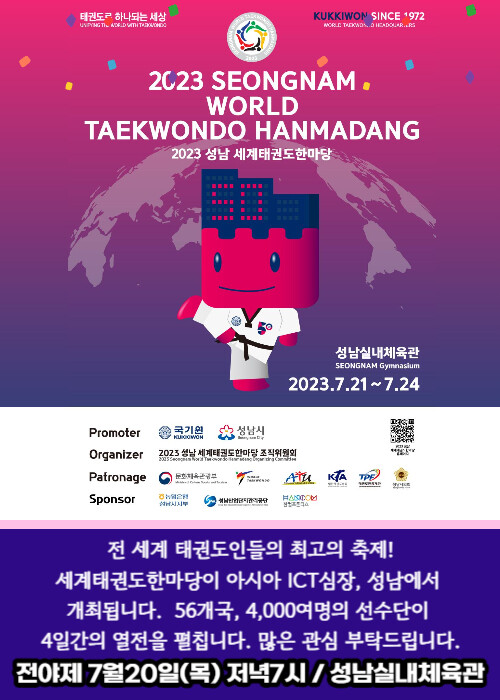 세계태권도 한마당 대회는 오는 7월 21일부터 24일까지 나흘간 성남실내체육관, 성남스포츠센터(중원구 성남동) 등에서 열린다.