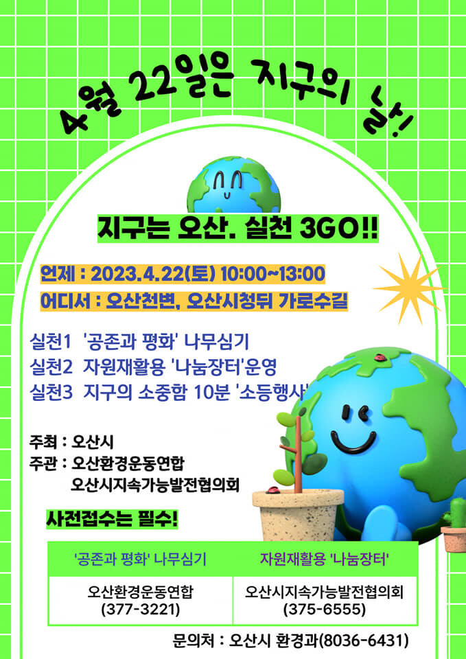 그리고 우리 오산시민들과 자연환경을 보존하고 지구를 살리는 작은 실천부터 시작해 보고 싶다. 오산시는 지구의 날인 4월 22일 기후변화의 심각성과 탄소중립의 중요성을 알리고 온실가스 감축생활 실천 참여를 유도하기 위해 지속가능한 지구는 오산에서 먼저, 실천 3GO 행사를 한다고 밝혔다.