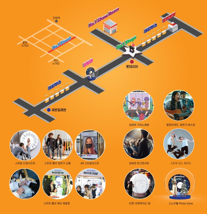 사흘간 14시부터 21시까지 안양일번가의 메인무대(안양로292번길28)를 중심으로 ▲넘버원 스테이지(일번가 거리공연, 디제잉 파티, 댄스 파이터, 거리 노래방) ▲넘버원 쇼룸(일번가 쇼룸, 스마트 인생사진관 등) ▲넘버원 스트리트(뷰티 체험존, 키링 만들기) 등 다양한 체험 프로그램이 진행된다.