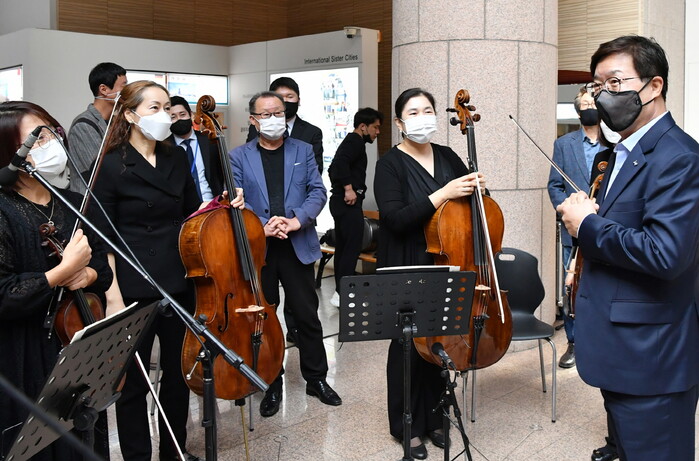 사진/ 지난해 11월 수원시청 로비에서 ‘수원시립교향악단과 함께하는 힐링음악회’가 열려 염태영 수원시장과 단원들이 대화를 나누고 있다.(사진제공=수원시)
