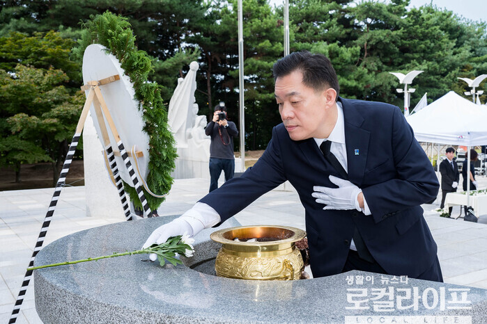 | ▲ 이재준 수원특례시장이 광복절 기념식에서 헌화하고 있다. (사진출처=이재준 페이스북) |
