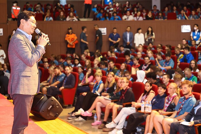 [로컬라이프] 이상일 용인특례시장이 10일 용인에 머물고 있는 ‘제25회 세계스카우트잼버리’ 참가 대원들을 위해 시가 마련한 공연장을 찾아 용인특례시를 영어로 소개하며 환영의 뜻을 밝혔다.