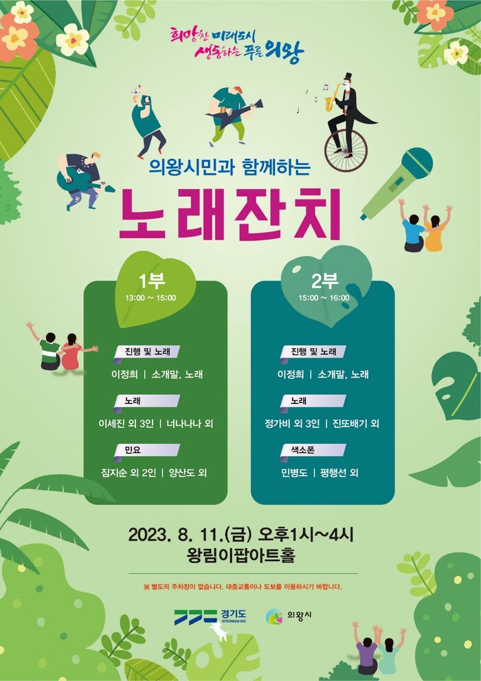 왕림이팝아트홀에서 성황리에 열리고 있는 ‘예술이 팝팝 데이’의 8월 공연 중 하나인 이번 노래잔치는 다양한 노래와 악기 연주를 시민들에게 들려주고, 시민들이 직접 참여하는 공연도 함께 진행할 예정이다. 공연은 총 1부, 2부로 나눠 오후 1시부터 4시까지 진행된다.