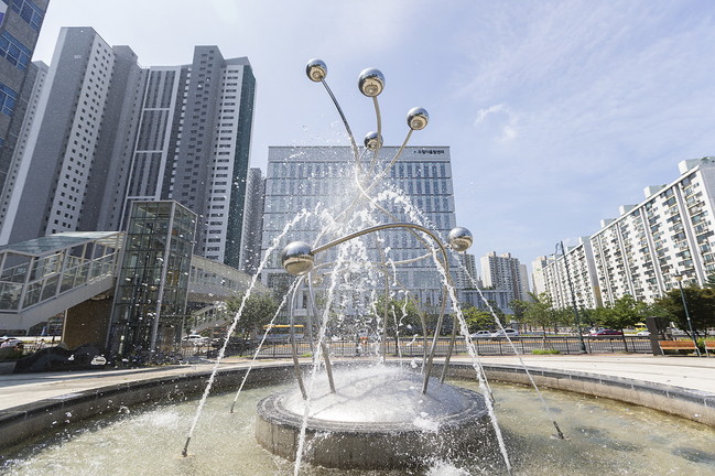 [로컬라이프] 폭염주의보가 내려진 25일 의왕시 포일어울림센터 맞은 편에 위치한 물빛근린공원 분수의 시원한 물줄기가 시민들의 무더위를 잊게 만들고 있다.